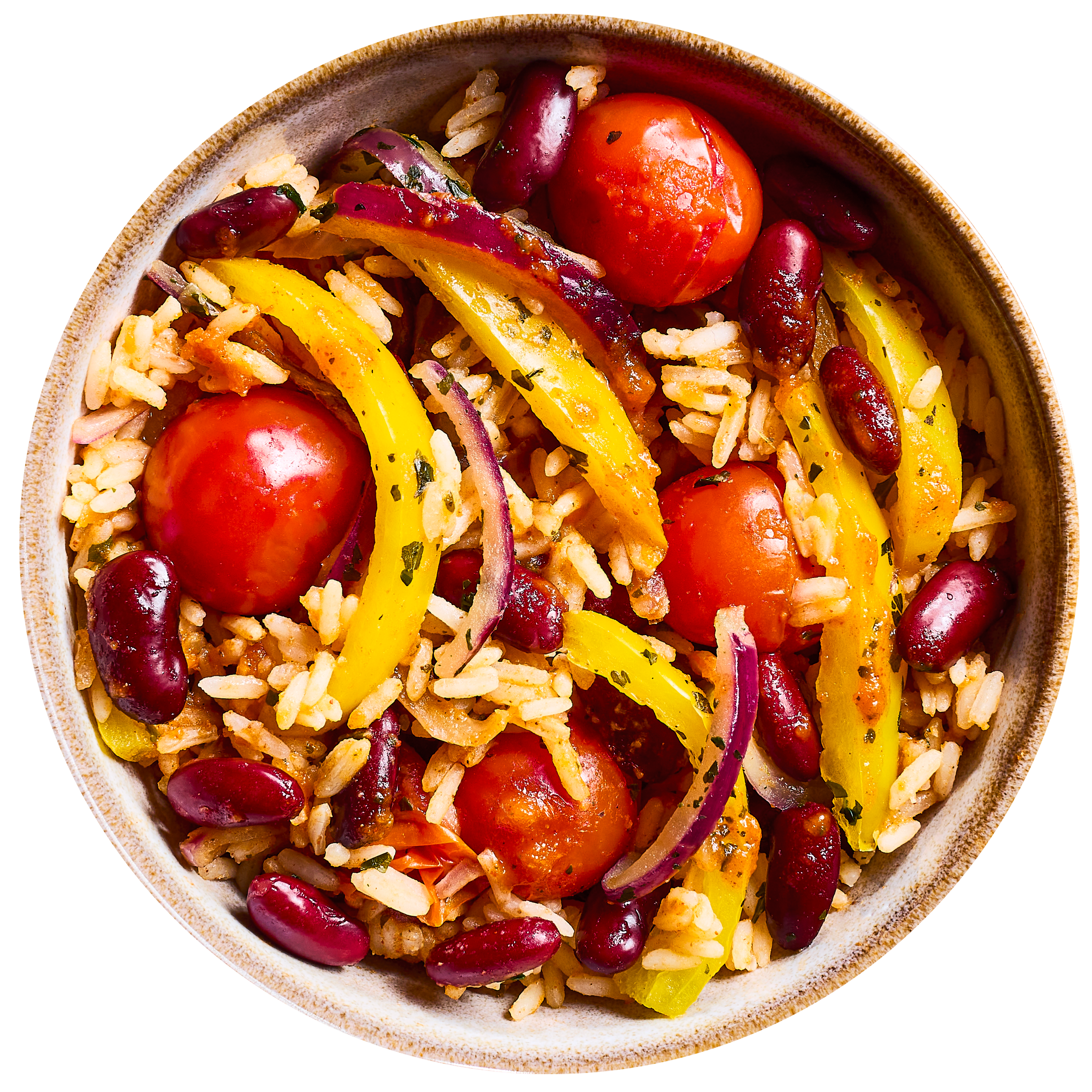 A mix of cooked long grain rice, tomatoes, bell pepperS, red kidney beans and red onion with a spicy tomato and onion sauce